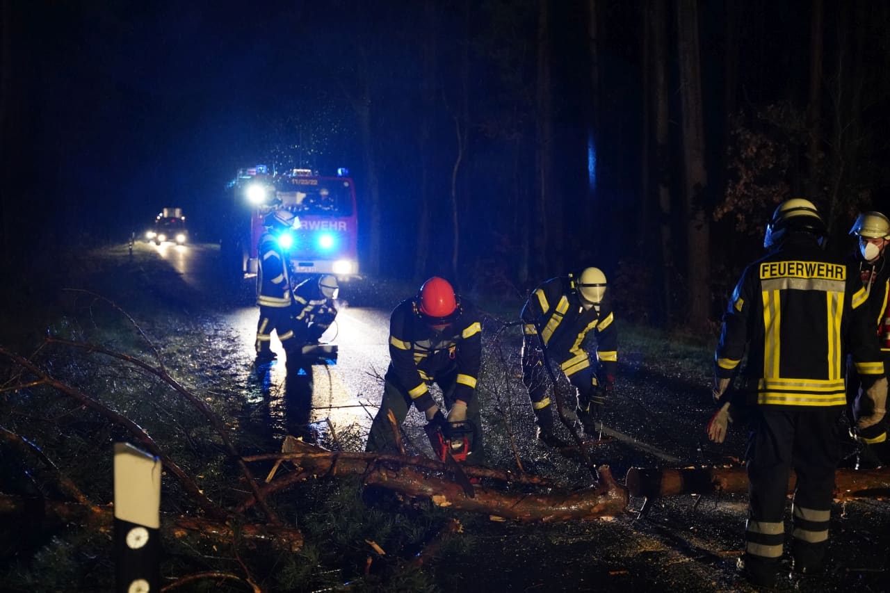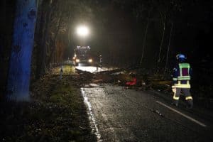 Abgebrochene Baumkrone über der Fahrbahn, mit Drehleiter angeschlagen und heruntergezogen.