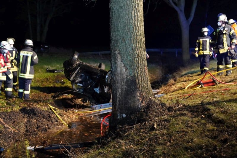 Der Kleinwagen prallte gegen einen Straßenbaum und landete im Graben.