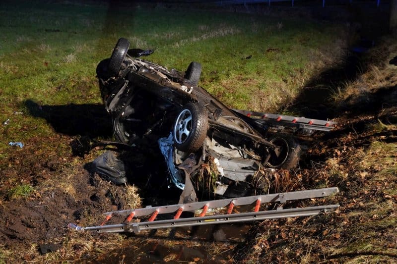 Bis zum Eintreffen der Rettungskräfte hielt eine Ersthelferin den Kopf der Fahrerin über der Wasserlinie. Die Feuerwehr befreite die Fahrerin mit einer Crashrettung aus dem PKW.