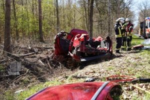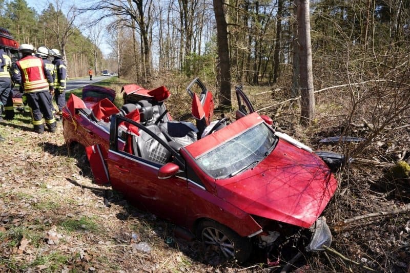 Verkehrsunfall auf der L221 zwischen Bleckede und der Abfahrt nach Breetze: Ein PKW kam beim Überholvorgang in Richtung Lüneburg links von der Fahrbahn ab, kollidierte mit einem Baum und bohrte sich in die Böschung.