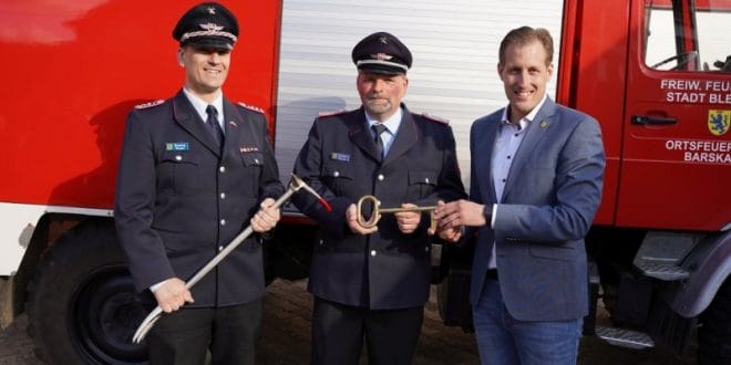 Jetzt konnte der Anbau durch Bürgermeister Dennis Neumann offiziell an Stadtbrandmeister Henning Wanke übergeben werden. Den symbolischen Schlüssel für den Anbau gab der Stadtbrandmeister weiter an Ortsbrandmeister Michael Warner – zusammen mit einem „Halligan-Tool“ (ein Hebel- und Brechwerkzeug).