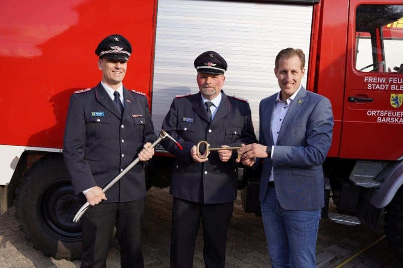 Foto 1, von links: Stadtbrandmeister Henning Wanke, Ortsbrandmeister Michael Warner und Bürgermeister Dennis Neumann