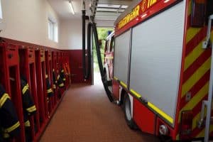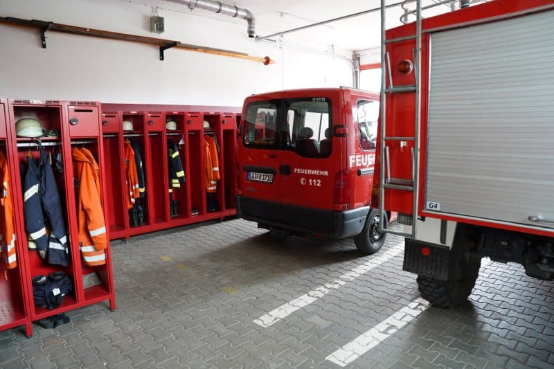 Neben der elektronischen Torsteuerung, Druckluft- und Batterieerhaltung und Abgasabsauganlage wurde auch die Lagerung der persönlichen Schutzausrüstung optimiert: Einsatzabteilung und Jugendfeuerwehr erhielten neue Spinde.