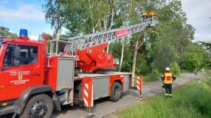 Ast über Fahrbahn – Gefahr mit Drehleiter entfernt.