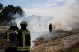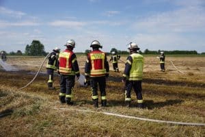 Brandursache war vermutlich ein im Brandbereich aufgefundenes Metallstück, das in Kontakt mit dem Mähdrescher Funken gerissen hat.