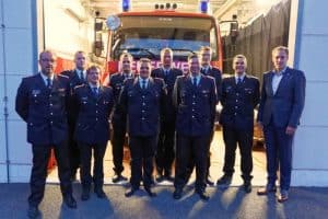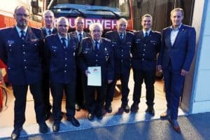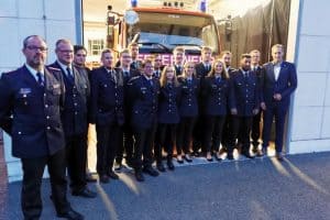 Ortsbrandmeister Lorenz Reimers, Rafael Kröpke, Thies Bastemeyer, Hauke Born, Jascha Obst, Kai Idler, Leon Haemmerich, Lucien Bera, Melina Hertel, Lennart Scholz, Julia Backhaus, Torben Meins, Lea Meins, Hannes Jeskulke, Mohammed Hassan, Stadtbrandmeister Henning Wanke und Bürgermeister Dennis Neumann.