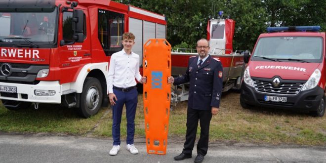 Foto: Jamero Ernst übergibt das Rettungsbrett an Ortsbrandmeister Lorenz Reimers
