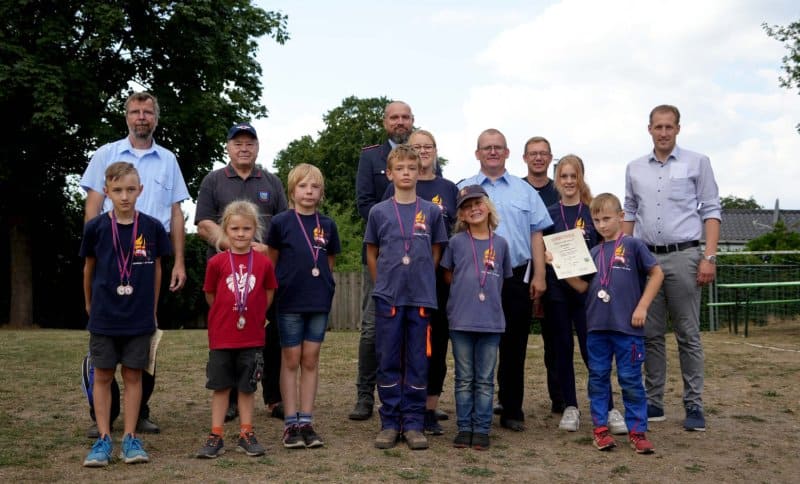 Hintere Reihe von links: Ortsbrandmeister Carsten Banse, Ehrenortsbrandmeister Heinz Jasker, Stadtkinderfeuerwehrwart Sando Nickelt, das Göddinger Kinderfeuerwehrteam Anja und Martin Zehm, Stellv. Stadtbrandmeister Falk Bardenhagen und Bürgermeister Dennis Neumann