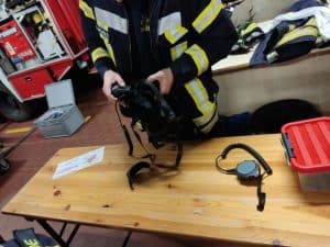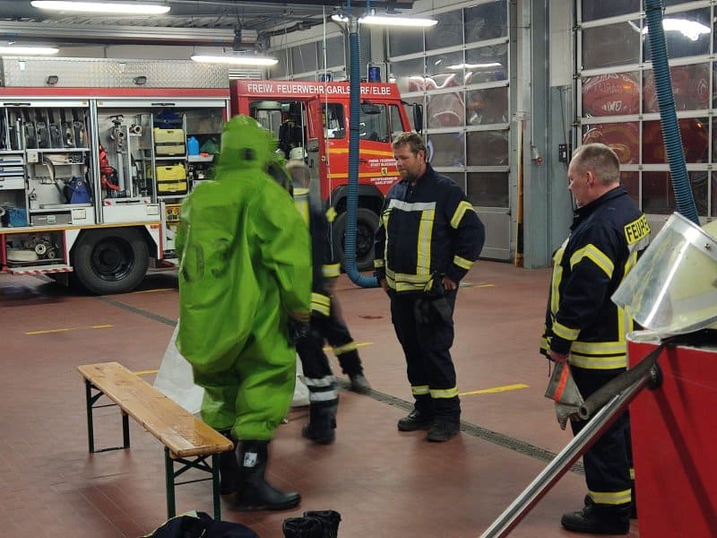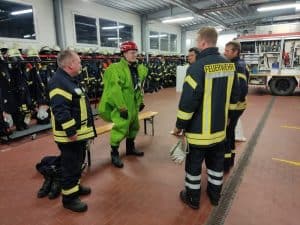 Stationsausbildung im Feuerwehrhaus: Chemikalienschutzanzug (CSA), Kommunikation und Dekontamination.