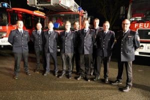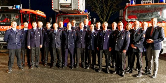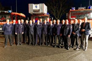 Von links: Stadtbrandmeister Henning Wanke, Johannes Charkowski, Kai Hanelt, Hermann Blanquett, Jens Albrecht, Falk Bardenhagen, Andre Berdien, Finn Gödecke, Haiko Schulz, Gideon Rehbein, Ari Wolter, Lucien Bera, Hannes Jeskulke, Jens Schaar, Jascha Obst, Axel Bormann, Sarah Bockelmann, Ortsbrandmeister Lorenz Reimers, Eckhard Sommer und Bürgermeister Dennis Neumann