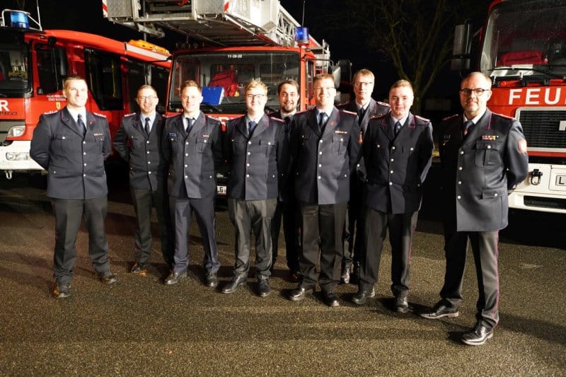 Beförderungen, von links: Stadtbrandmeister Henning Wanke, Falk Bardenhagen, Finn Gödecke, Jascha Obst, Hannes Jeskulke, Andre Berdien, Haiko Schulz, Gideon Rehbein und Ortsbrandmeister Lorenz Reimers
