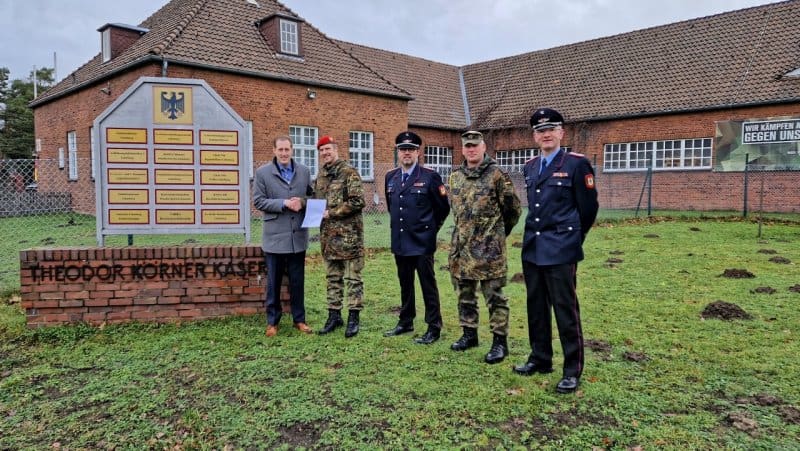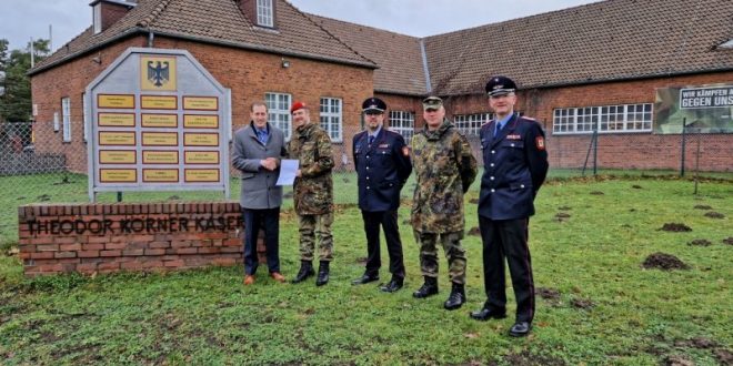 Bild, von links: Bürgermeister Dennis Neumann überreicht Batteriechef Major Christian Voigt den Antrag auf die Patenschaft. Dabei sind Ortsbrandmeister Lorenz Reimers, Batteriefeldwebel (Spieß) Oberstabsfeldwebel André Franck, Stellvertretender Ortsbrandmeister Carsten Schmidt