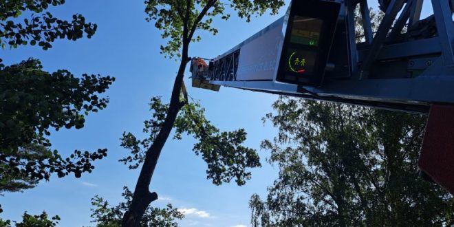 Unterstützung des Bauhofes mit der Drehleiter – gemeinsam wurde die Gefahrenstelle entfernt.