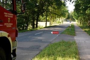 Bei Waldbränden standen vor vielen Jahren oft Einweiser am Waldrand – in den letzten Jahren werden gekippte Verkehrsleitkegel als Wegweiser benutzt.