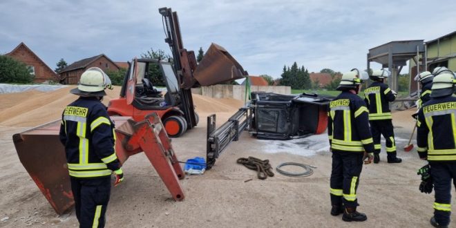 Bei einem Arbeitsunfall bei einer Firma am Bleckeder Hafen kippte ein Gabelstapler um: