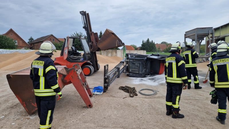 Bei einem Arbeitsunfall bei einer Firma am Bleckeder Hafen kippte ein Gabelstapler um: