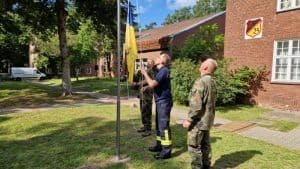 Bürgermeister Dennis Neumann durfte mit Batteriechef Major Christian Voigt und Spieß Oberstabsfeldwebel Andre Franck den Bleckeder Löwen vorm Batteriegebäude hissen.