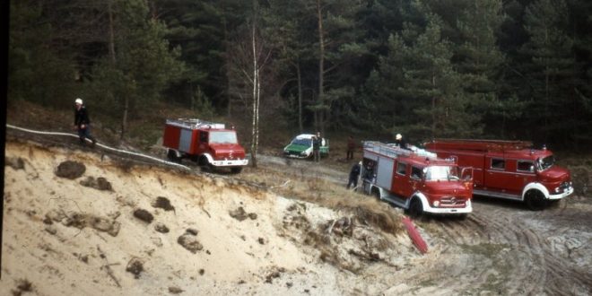 Es zeigt das Tanklöschfahrzeug der Feuerwehr Barskamp (TLF 8 W, Baujahr 1978) sowie das Tanklöschfahrzeug (TLF 16/25, Baujahr 1976) und das Löschgruppenfahrzeug (LF 16-TS, Baujahr 1963) aus Bleckede bei einem Waldbrand im Bereich Köstorfer Berg.