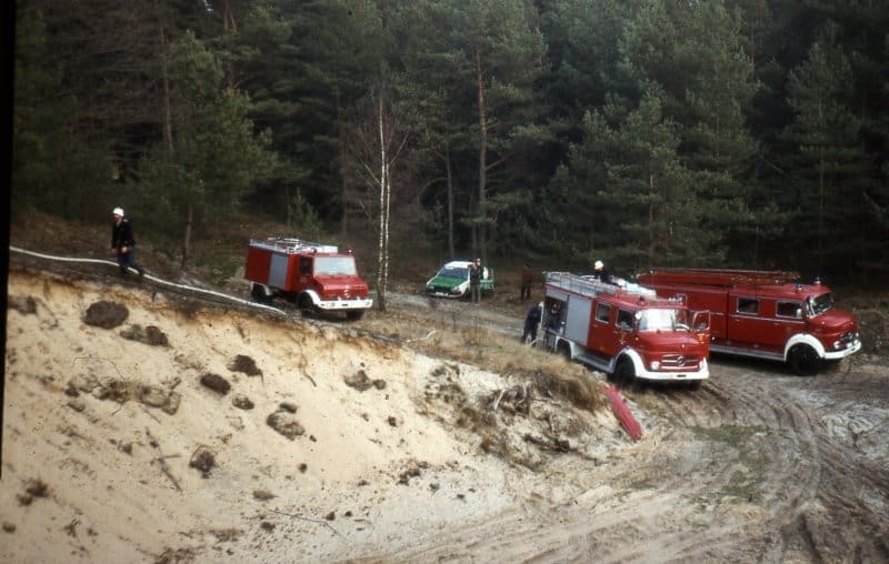 Es zeigt das Tanklöschfahrzeug der Feuerwehr Barskamp (TLF 8 W, Baujahr 1978) sowie das Tanklöschfahrzeug (TLF 16/25, Baujahr 1976) und das Löschgruppenfahrzeug (LF 16-TS, Baujahr 1963) aus Bleckede bei einem Waldbrand im Bereich Köstorfer Berg.
