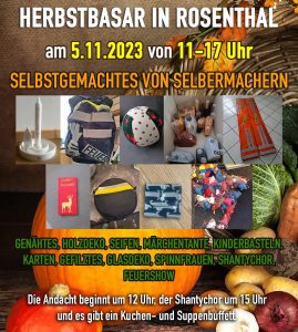 Der Basar am 05. November beginnt mit einer Andacht um 12:00 Uhr, es gibt ein Kuchen- und Suppenbuffett und der Shantychor tritt auf.
