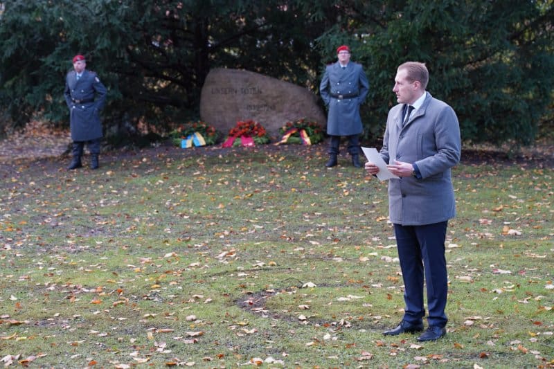 Bürgermeister Dennis Neumann hielt die Ansprache zum Gedenken an die Opfer der Kriege, von Gewalt, Terror, Flucht und Vertreibung. „Frieden ist mehr als die Abwesenheit von Krieg“ war seine Kernbotschaft.