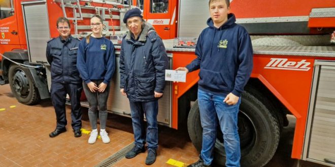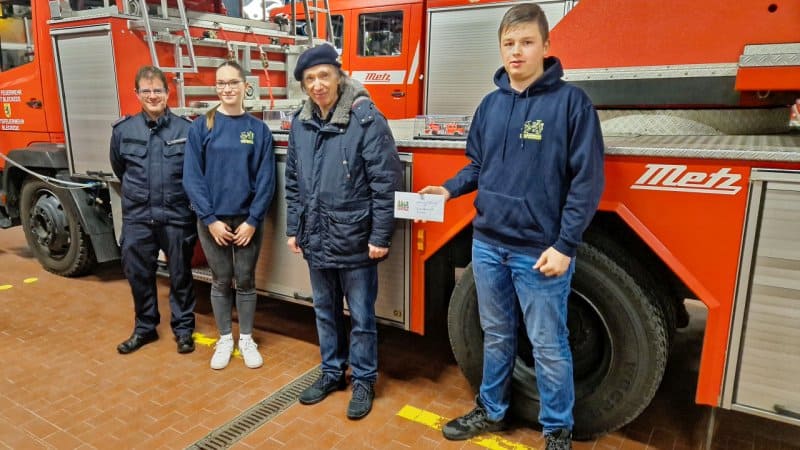 Richard Ledins ist Mitglied im Förderverein der Ortsfeuerwehr. Er überbrachte der Jugendfeuerwehr zwei Feuerwehrmodelle für ihren Jugendfeuerwehraum und ein „Flachgeschenk“ für die Jugendarbeit der Feuerwehr.