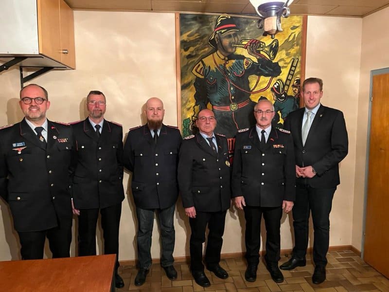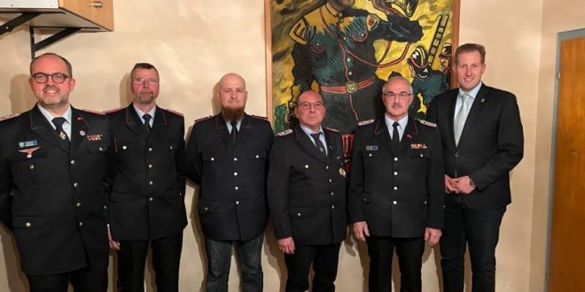 Foto, von links: Stellv. Stadtbrandmeister Lorenz Reimers. Ortsbrandmeister Carsten Banse, Michael Ottlinger, Eckart Hoppe, stellv. Ortsbrandmeister Uwe Claus und Bürgermeister Dennis Neumann.