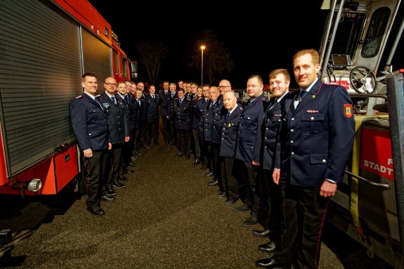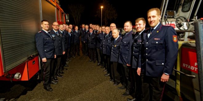 Foto mit allen Gewählten, Geehrten, Neuaufnahmen und Beförderten. Rechts Bürgermeister Dennis Neumann, links Stadtbrandmeister Henning Wanke und Ortsbrandmeister Lorenz Reimers
