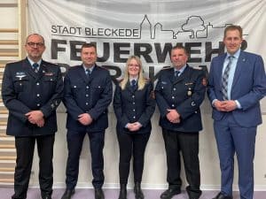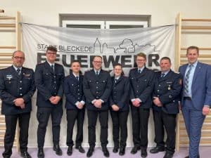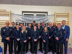 Foto, von links: Stellv. Stadtbrandmeister Lorenz Reimers, Jan-Thomas Johannsen, Anton Dräger, Denys Raykov, Johanna Warner, Björn Evers, Hannes Fischer, Lena Beug, Dennis Holstein, Dieter Gehrke, Nathalie Senkbeil, Uwe Schütte, Maik Berkenbusch, Michael Warner, Bürgermeister Dennis Neumann