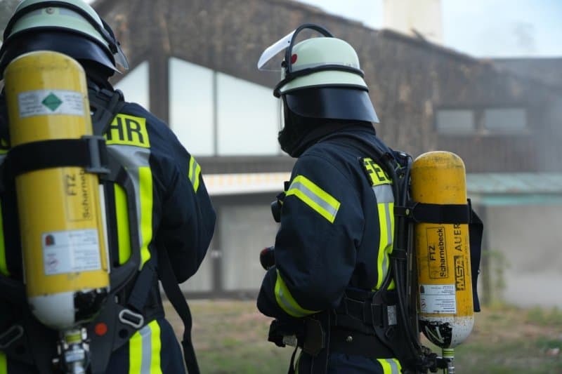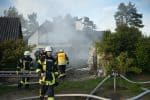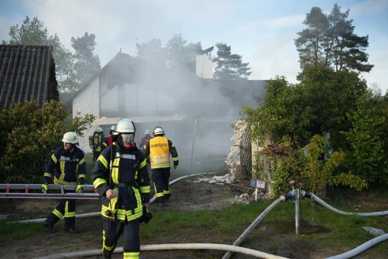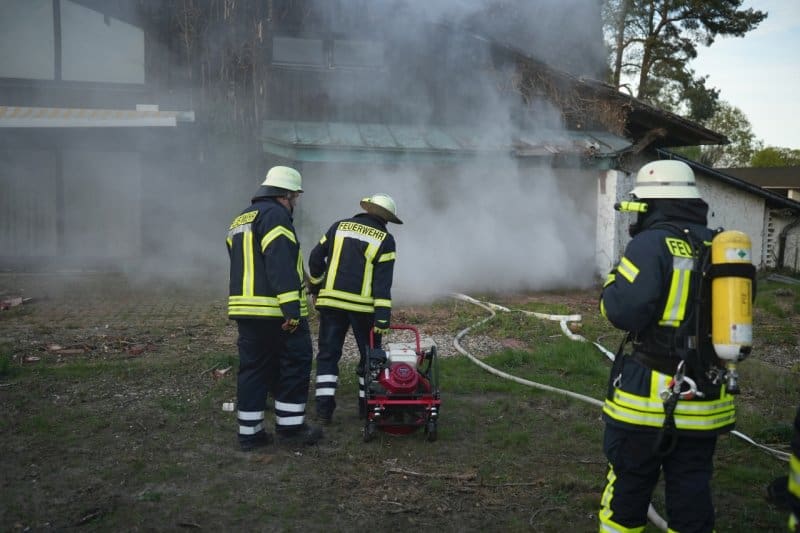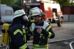 Neben dem Atemschutzeinsatz musste eine Löschwasserversorgung aufgebaut werden – mehrere Strahlrohre wurden im Innenangriff und im Außenangriff zur Brandbekämpung eingesetzt.