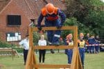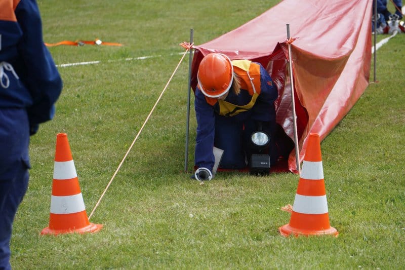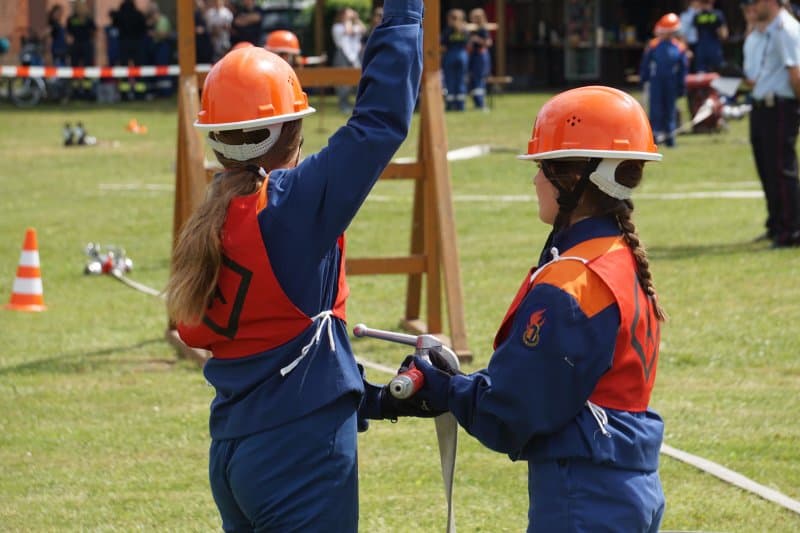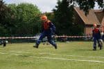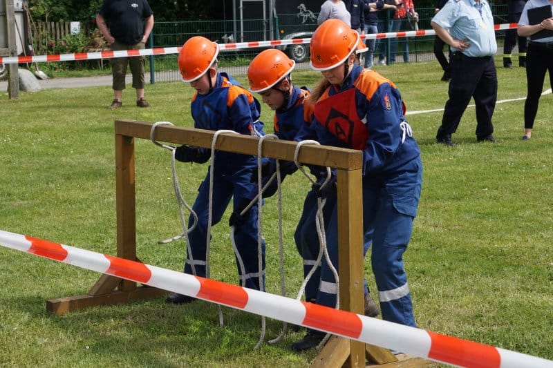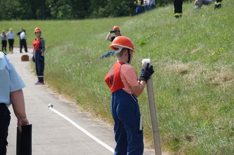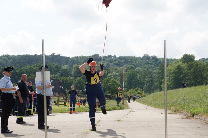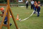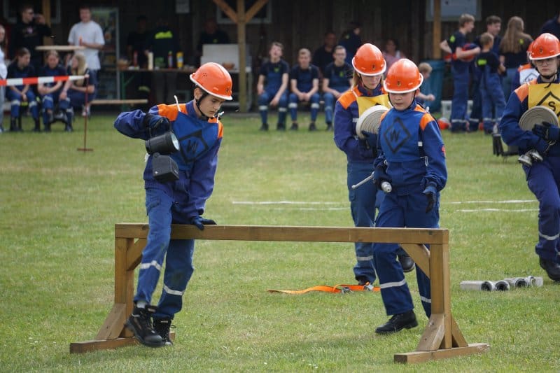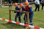 Die Jugendfeuerwehren müssen einem einen dreiteiligen Löschangriff aufbauen, wobei Wassergraben, Leiterwand, Hürde und Tunnel als Hindernis überwunden werden muss.