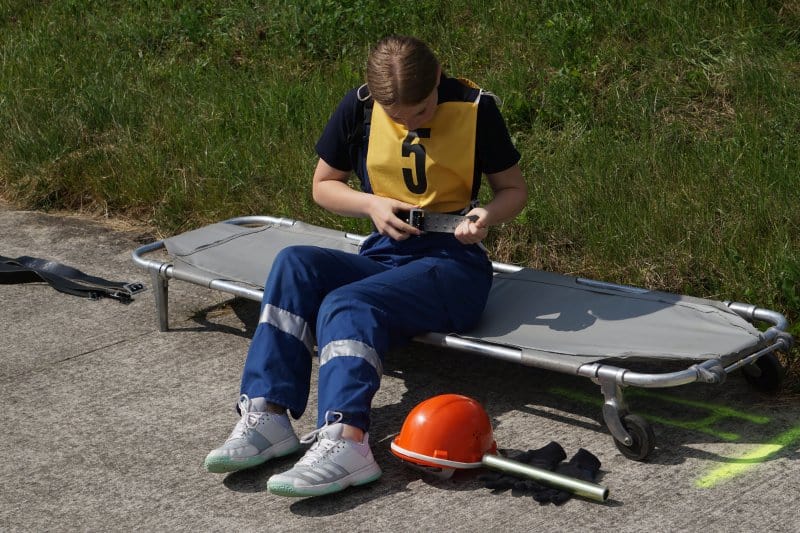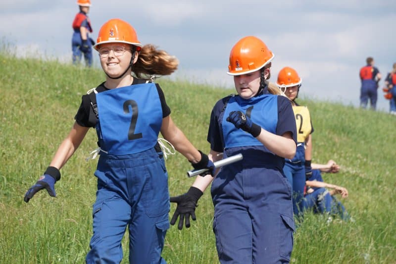 Im zweiten Teil treten die Jugendlichen bei einen Staffellauf gegeneinander an. Auch hier müssen Aufgaben gemeistert werden: Schlauchrollen, Hürde überwinden, das schnelle anziehen der Persönlichen Schutzausrüstung, das richtige einbinden von einem Strahlrohr und am Ende Zielwurf einer Leine.