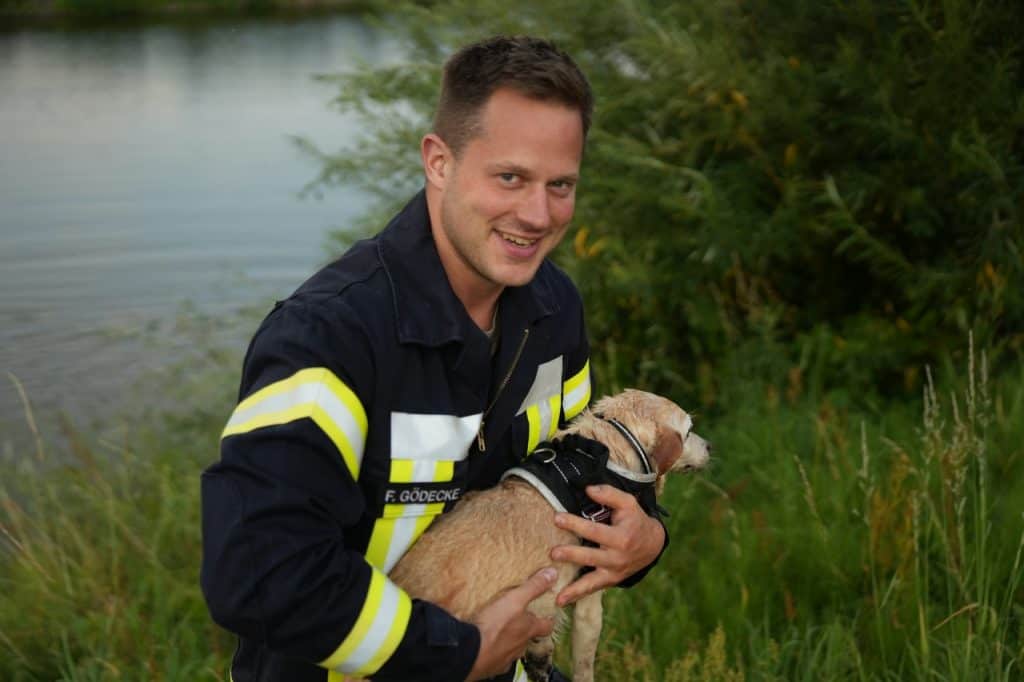Eine Einsatzkraft schwamm zu dem Hund und holte ihn ans Ufer: Der Mischling Candy war komplett erschöpft und unterkühlt. Er wurde in eine Decke gewickelt an seinen Besitzer übergeben.