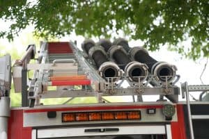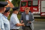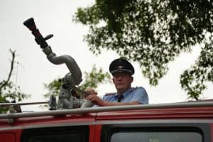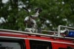 Ortsbrandmeister Florian Hornig an einem der zwei Wasserwerfer auf dem Fahrzeugdach