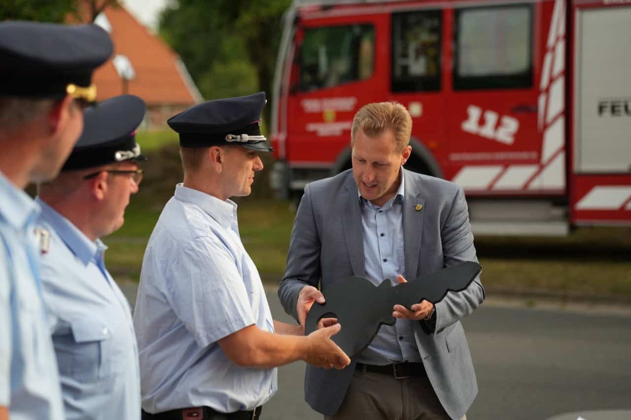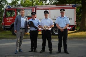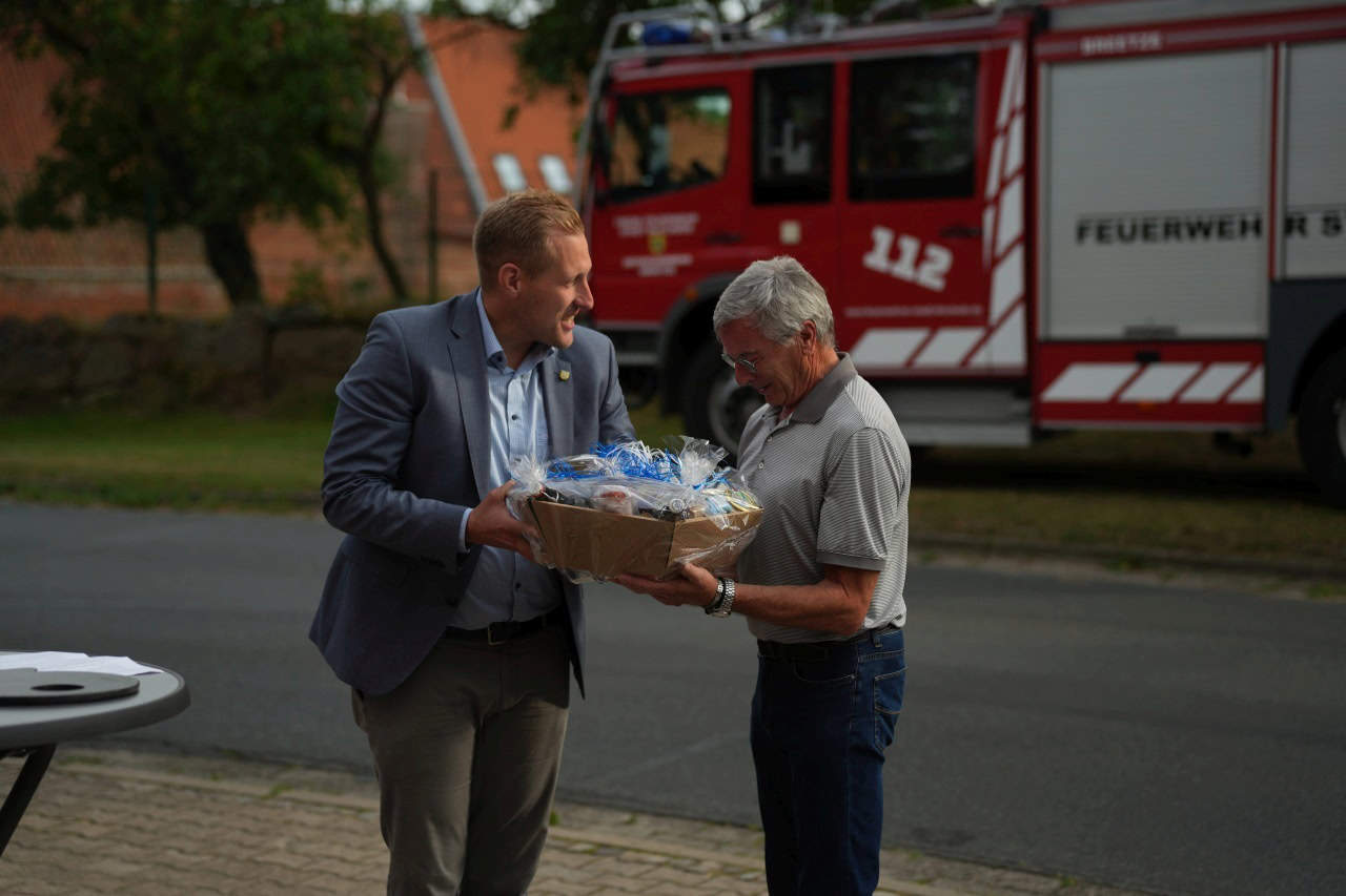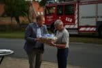 Bürgermeister und Stadtbrandmeister würdigten den großen Einsatz der Breetzer für ihr „neues“ Tanklöschfahrzeug. Der Bürgermeister dankte Dietrich Dehnke mit einem Präsentkorb, Ortsbrandmeister Florian Hornig bekam eine Tafel mit den niederländischen Schlauchkupplungen vom Stadtbrandmeister.