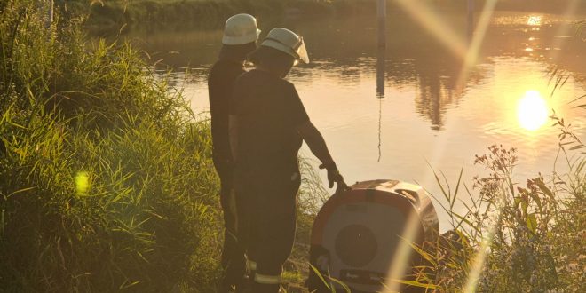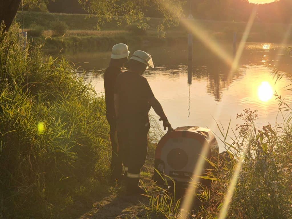 Tragkraftspritze, offenes Gewässer und Sonnenuntergang.