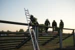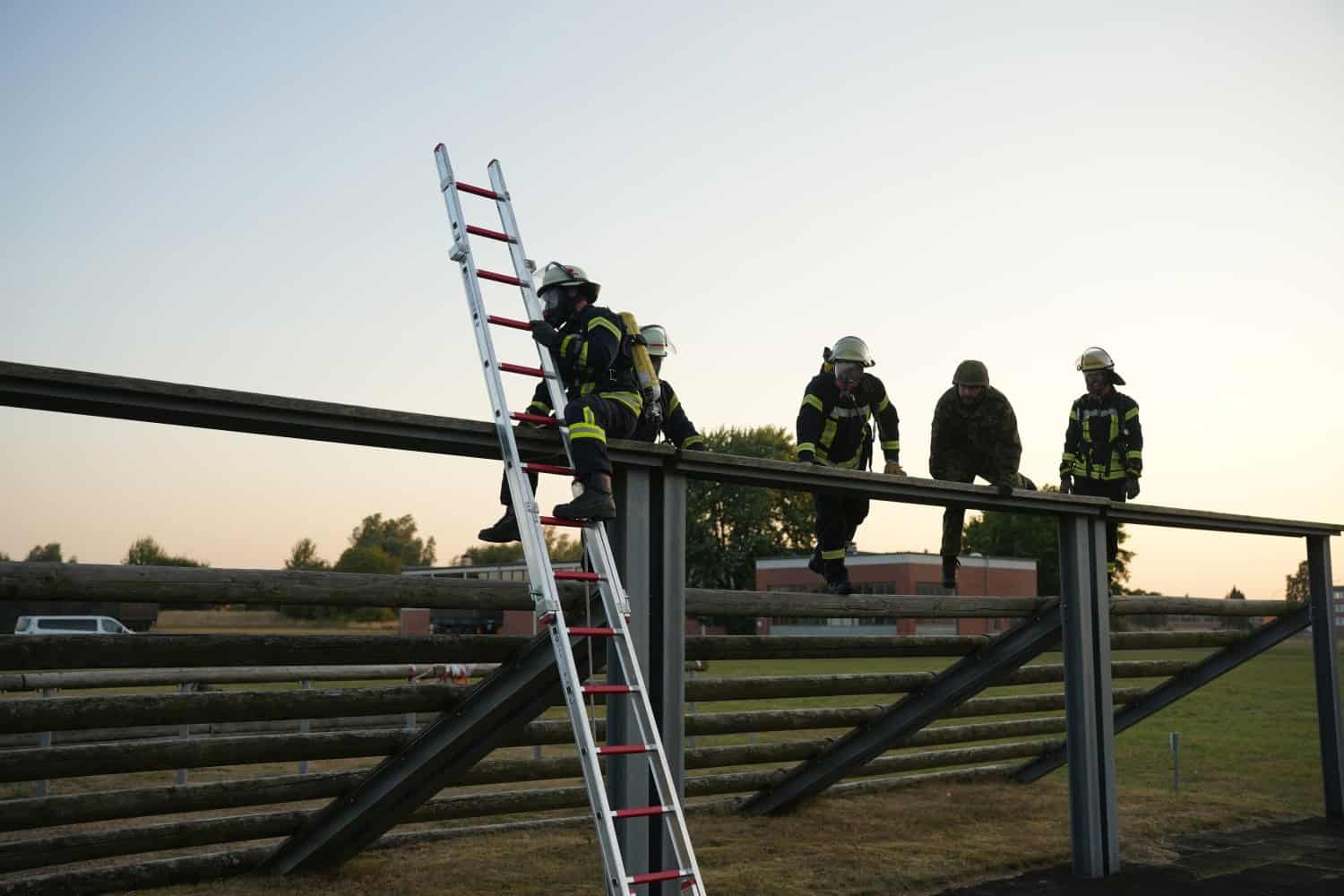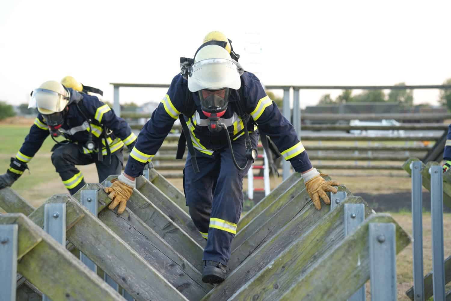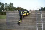 Die 12 Hindernisse hatten sehr unterschiedliche Schwierigkeitsgrade. Für die Unfallverhütung wurde an der „Hühnerleiter“ und an der Holzwand mit Steckleitern gearbeitet. Einige Einsatzkräfte überquerten die Eskaladierwand aber wie die Soldaten: Mit Kraft und Technik.