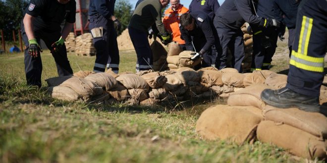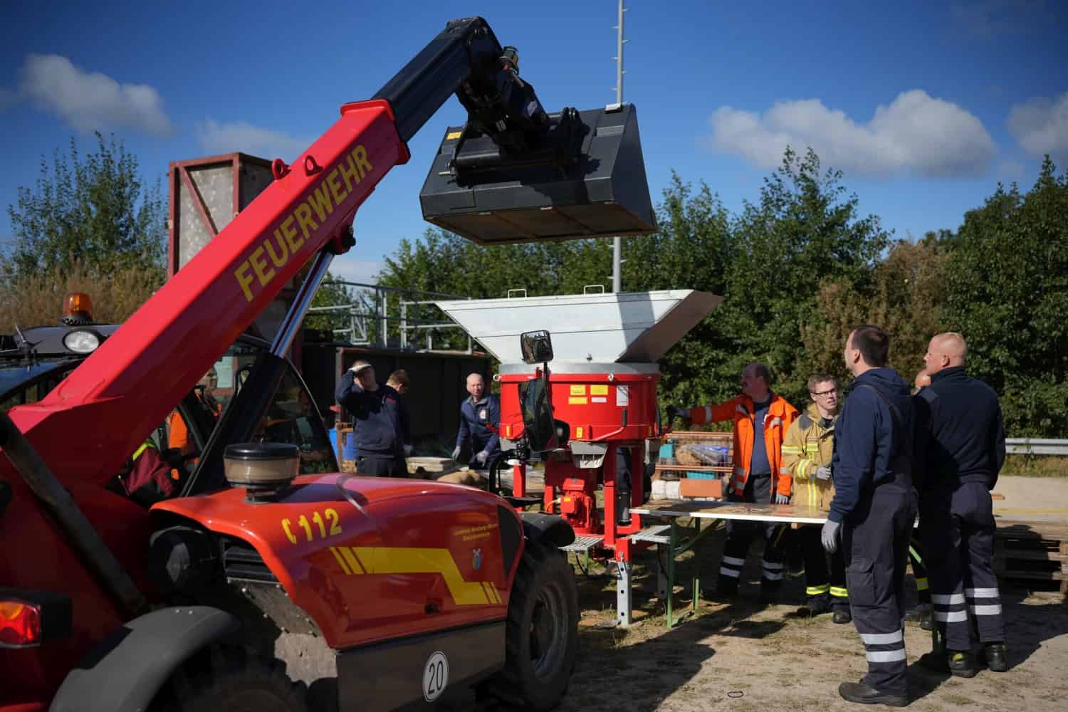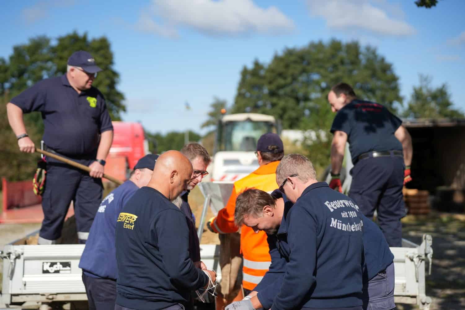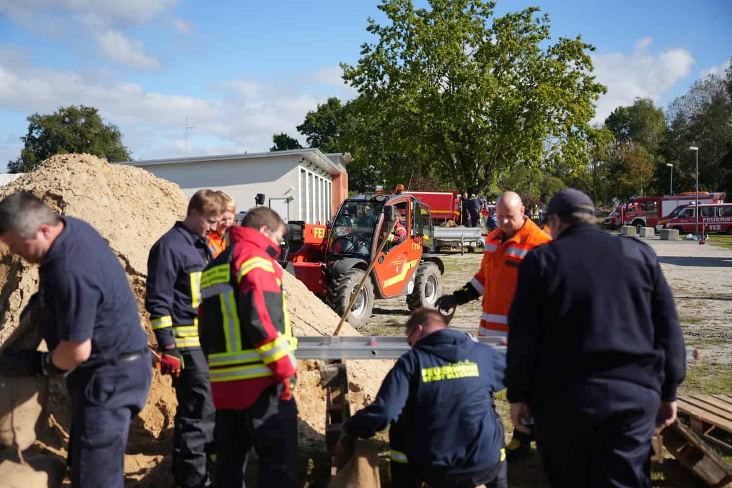 Die Bereitschaft ist zur Ausbildung mit eigener Versorgungseinheit und eigenen Sandsackfüllmaschinen inklusive Teleskoplader angerückt.