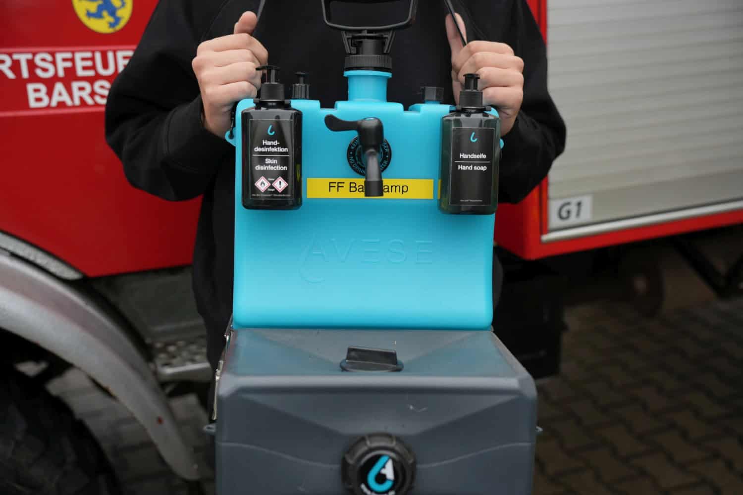 Ein mobiles Hygieneboard für die Einsatzstellenhygiene. Mit diesem mobilen Waschbecken können Hände nach dem Einsatz überall gewaschen und desinfiziert werden.