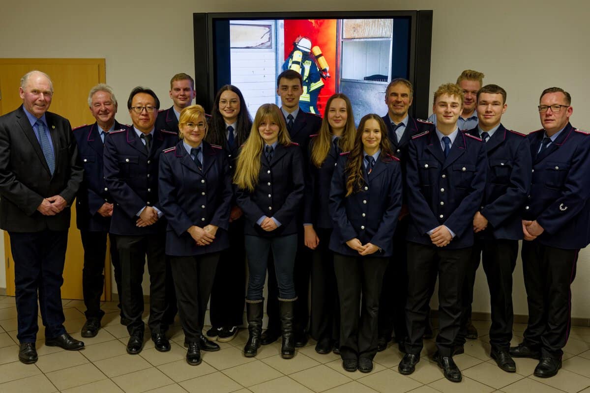 Gruppenfoto, von links: Stellv. Bürgermeister Herbert Beusch, Gerhard Brückmann, Ying Zehng, Janek Voß, Andorte Brendemühl-Hornig, Karlotta Hoffmann, Svenja Laging, Felix Kluth, Finja Junker, Tia Nottebohm, Michael Nottebohm, Fritz Hoffmann, Lennes Timmermann, Dennis Burmeister und Ortsbrandmeister Florian Hornig.