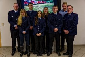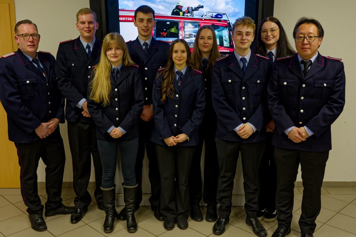 Beförderungen, von links: Ortsbrandmeister Florian Hornig, Janek Voß, Svenja Laging, Felix Kluth, Tia Nottebohm, Finja Junker, Fritz Hoffmann, Karlotta Hoffmann und Ying Zehng