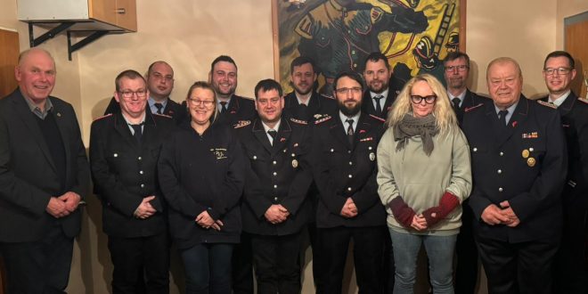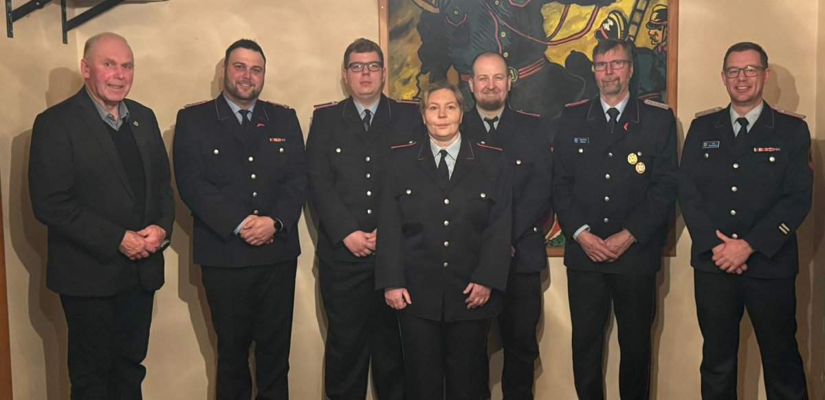Beförderte und Aufnahme, von links: Stellv. Bürgermeister Herbert Beusch, Marcel Claus, Benedict Schmeer, Sabine Schmeer, Michael Ottlinger, Ortsbrandmeister Carsten Banse und Stellv. Stadtbrandmeister Falk Bardenhagen