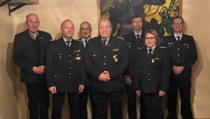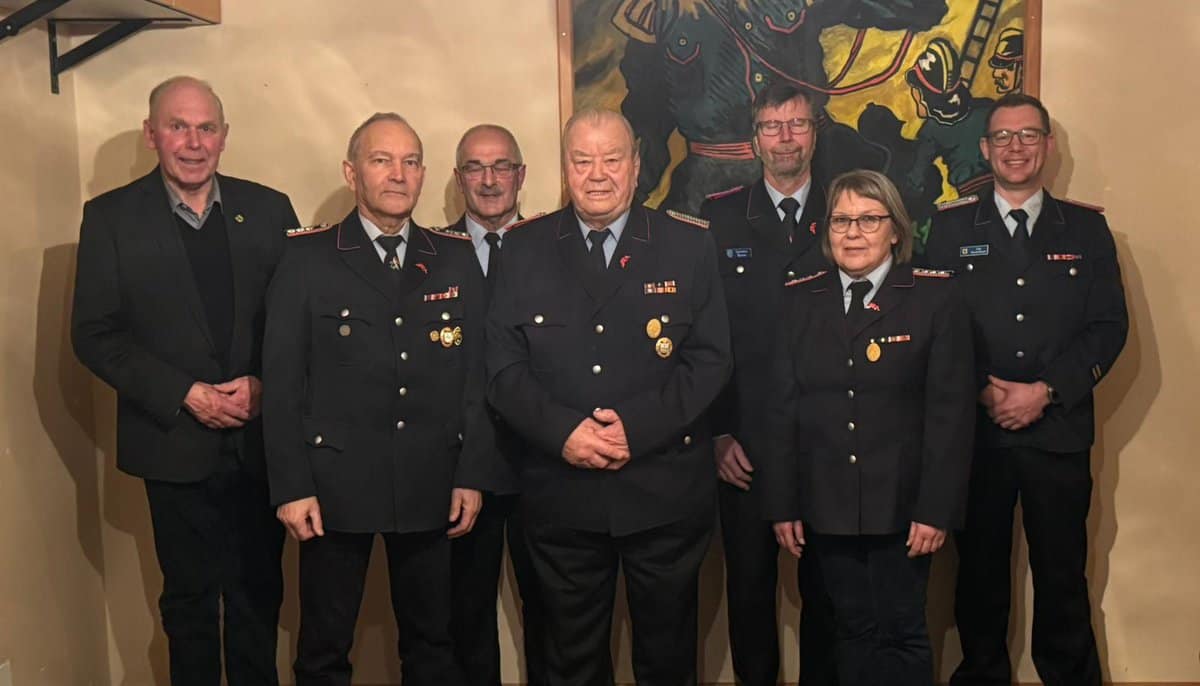 Geehrte, von links: Stellv. Bürgermeister Herbert Beusch, Reinhard Hoppe 32 Jahre Kassenwart, Uwe Claus, Ehrenortsbrandmeister Heinz Jasker, Ortsbrandmeister Carsten Banse, Annelene Banse, Stellv. Stadtbrandmeister Falk Bardenhagen