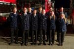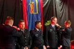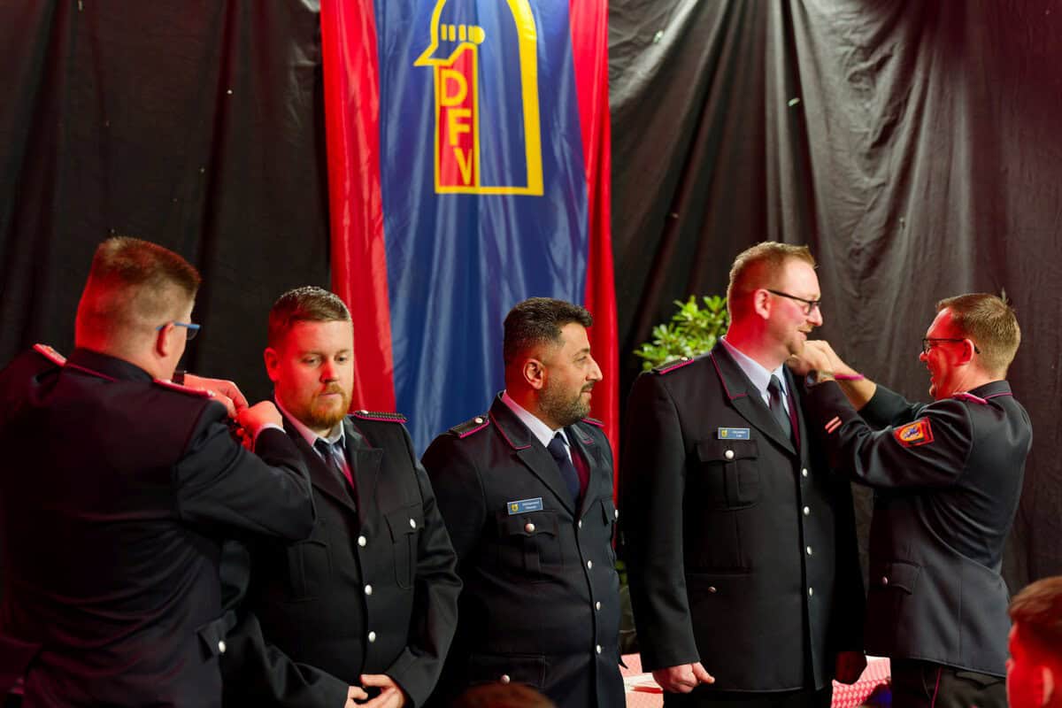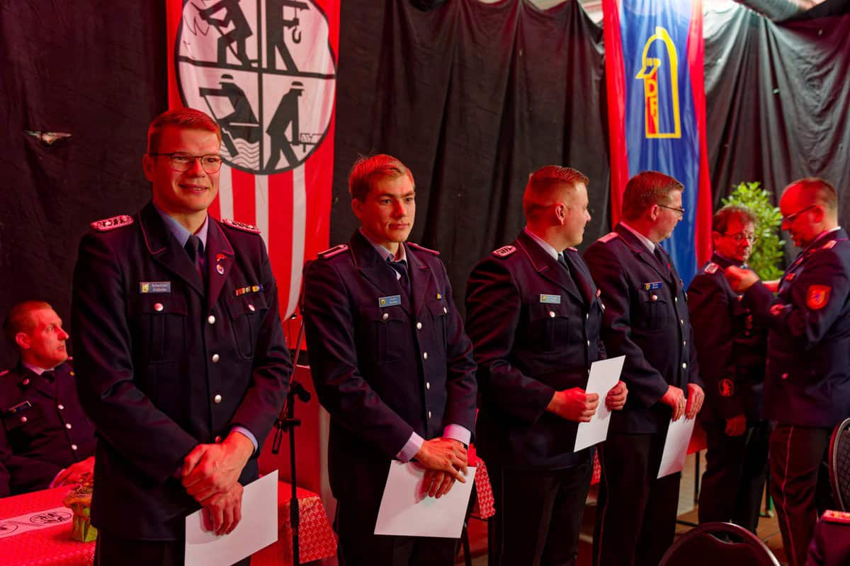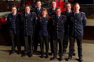 Alle Neuaufnahmen, Gewählte, Ernannte und Beförderte mit Ortsbrandmeister Lorenz Reimers (links) sowie Stellv. Stadtbrandmeister Falk Bardenhagen und Bürgermeister Dennis Neumann (rechts)