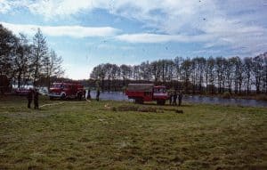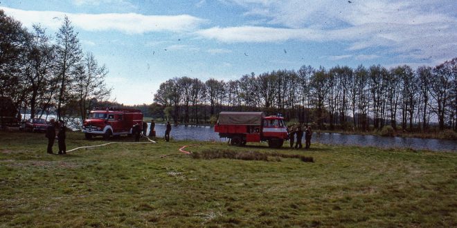 Das Foto aus dem Archiv der Feuerwehr Bleckede zeigt das Löschgruppenfahrzeug der Ortsfeuerwehr Bleckede (Baujahr 1963, links) bei einer gemeinsamen Übung mit der Feuerwehr Neuhaus/ Elbe im Jahr 1990 – damals wurde gemeinsam geübt und gefeiert.