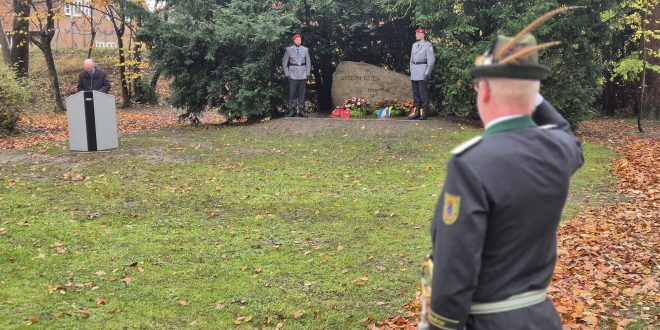 Bei der Kranzniederlegung am Ehrenmal im Schlosspark waren nicht nur Abordnungen der Schützengilde und der Feuerwehr angetreten – auch die Patenbatterie der Stadt Bleckede war dabei. Die Abordnung der 2. Batterie des Artillerielehrbataillons 325  legte ebenfalls einen Kranz nieder.