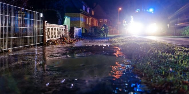 Die Feuerwehr leitete das Wasser in einen Gully um und pumpte bereits am Gebäude stehendes Wasser mit der Tauchpumpe ab. So konnte ein Wasserschaden im Keller verhindert werden.
