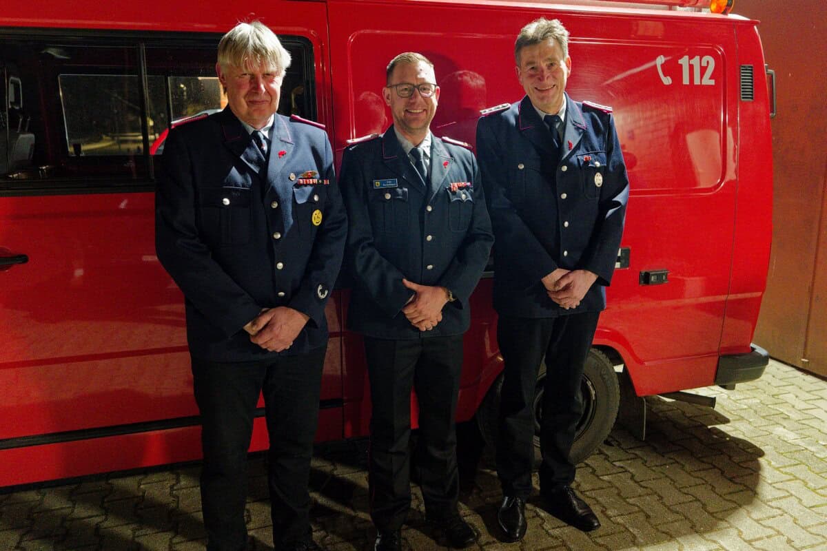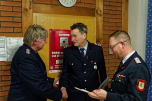 Ehrungen, von links: Ortsbrandmeister Ralf Bullmann, Stadtbrandmeister Falk Bardenhagen und Kai-Uwe Koch.