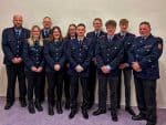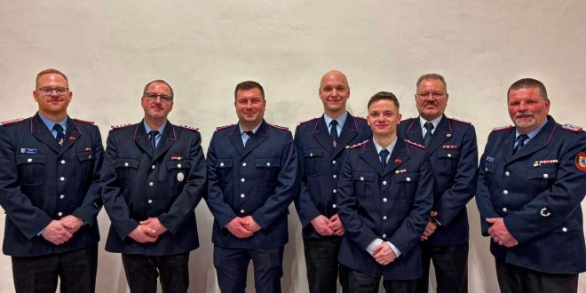 Die Beförderungen auf der Jahreshauptversammlung 2026 – rechts Ortsbrandmeister Michael Warner
