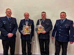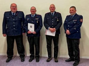 Foto, von links: Stellv. Ortsbrandmeister Uwe Schütte, Manfred Evers, Jürgen Wienke und Ortsbrandmeister Michael Warner